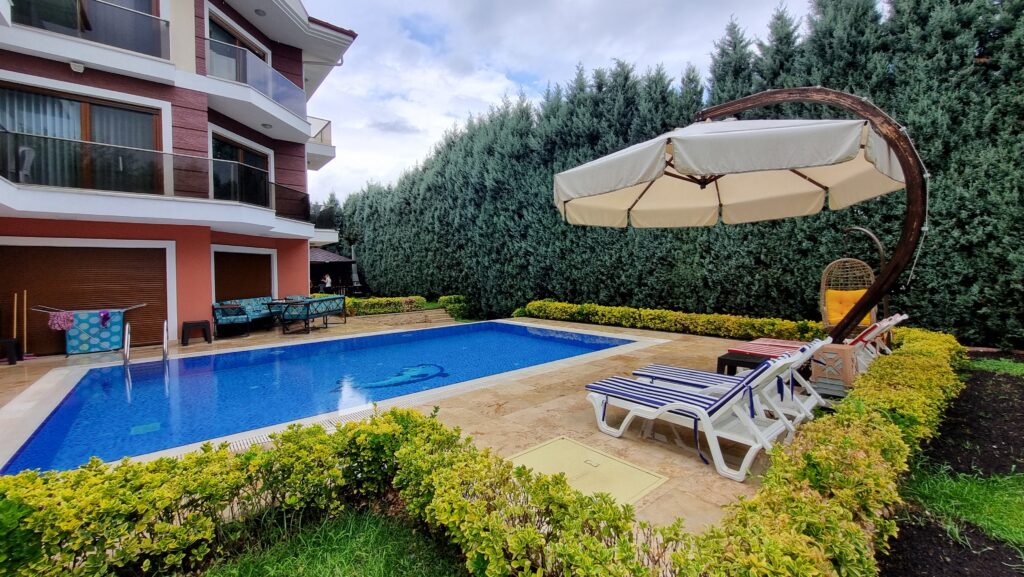 Villanın etrafı, 7-8 metre yüksekliğinde yaklaşık 150 adet çam ağacıyla çevrilmiş durumda. Bu sayede hem mahremiyet sağlanıyor hem de yemyeşil bir manzara eşliğinde benzersiz bir yaşam alanı sunuluyor. Geniş bahçesi, özel havuzu ve kamelyasıyla villa, doğayla iç içe huzurlu bir hayat vadediyor.